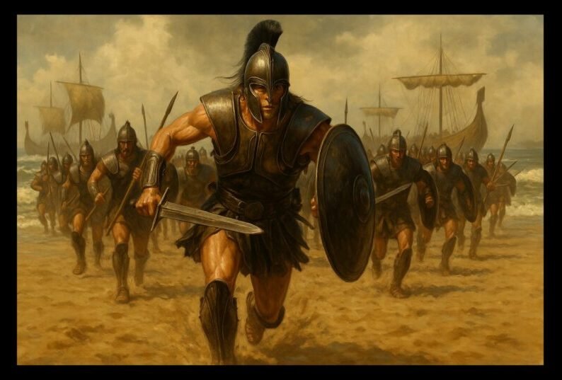 His brother Agamemnon, king of Mycenae, called the Greek kings to arms, raising a coalition of warriors to sail east and reclaim Helen. The campaign brought together legendary figures — Achilles, Odysseus, Ajax, and Nestor — under Agamemnon’s banner.
