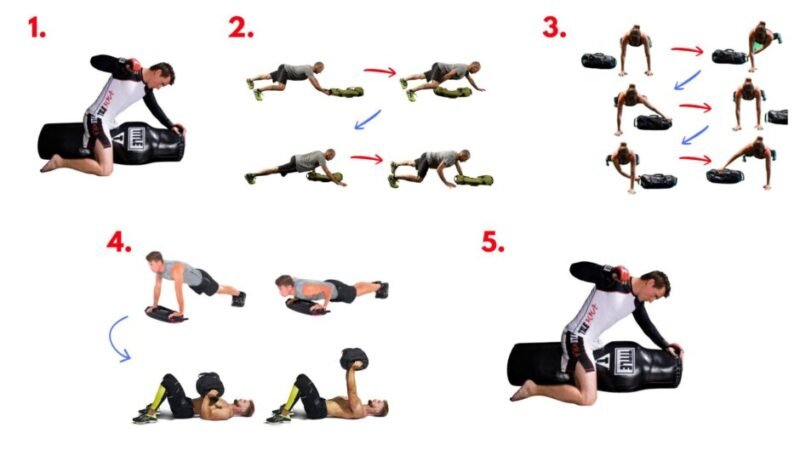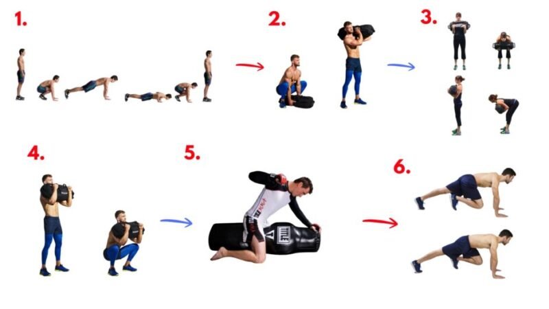 5 minutes of ‘Smash the Bag’ – Jog whilst carrying a sandbag on your shoulder for 25 metres, slam, 10 x ground and pound punches, sprint and back. Repeat.