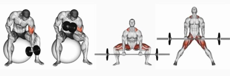 The biceps curl (left) isolates a single muscle through one joint, while the sumo deadlift (right) engages multiple joints and major muscle groups to develop full-body strength.